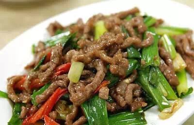 3.放入牛肉炒到九成熟,加入剩余的葱段,生抽,盐,鸡粉,白胡椒,香油。翻炒,出锅