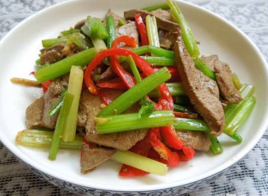 3、烧热锅,下入油,以猛火烧热,下猪肝煸炒,再加芹菜段炒,加入盐、胡椒分和生姜汁炒匀。