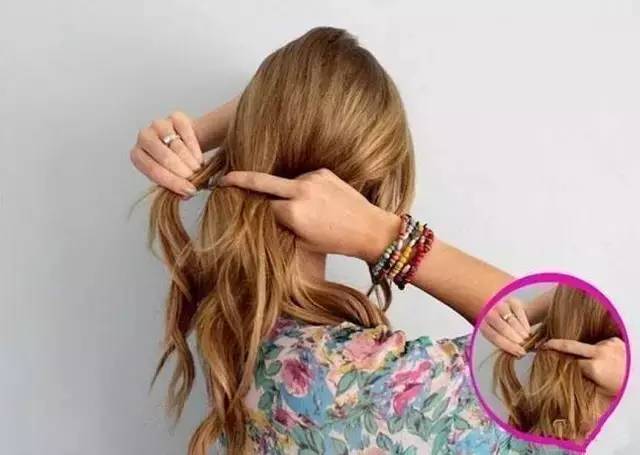Step 5:这个时候,把最左边的发束拉到中间的位置。