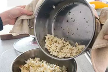 3.锅中的玉米炸开之后,将剩下的干玉米倒进锅中,但只需淹没锅底即可。用锅盖盖住,将锅移开,数30秒。