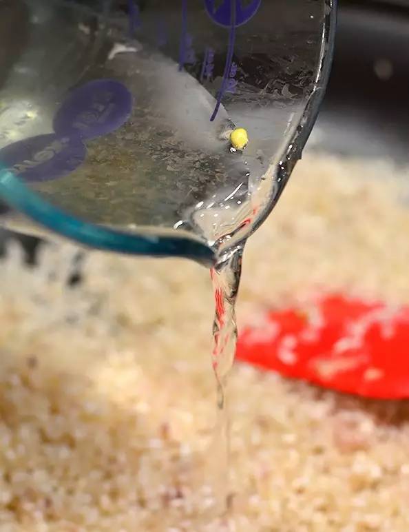 5.然后将干葡萄酒倒入锅中,搅拌直至米饭完全吸收。