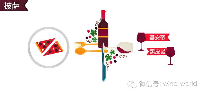 披萨是常见的食品,但是日常应该很少人用葡萄酒搭配披萨。但是当你在吃番茄或蒜香沙司披萨时,一款酒体轻盈的红酒能给你的美食体验增色不少。黑皮诺葡萄酒能与具有土壤气息的番茄、草药、烤鸡和蘑菇很好地搭配,意大利的经典基安帝(Chianti Classico)搭配披萨也很不错哟!
