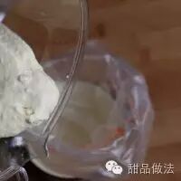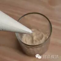 8. 裱花袋套在玻璃杯上,将打好的榴莲奶油糊倒入裱花袋中。