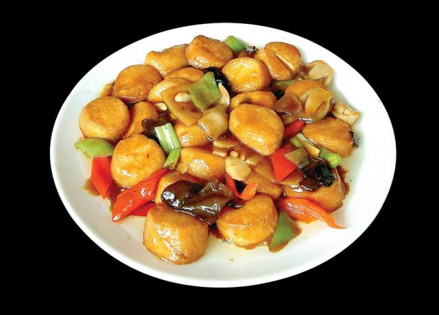7.再加入备用的鲜虾和豌豆。这时倒入刚才炸好的日本豆腐,由于易碎,最好是颠勺,而不是翻炒,如果最后汤汁比较多,要放入少许水淀粉,汤汁稍微粘稠后最好。
