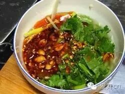 10、放入适量花椒油,芝麻油,红油辣椒即可(我煎红油辣椒的时候,放了花生芝麻的,麻辣味儿自己调节了,没有花椒油的用花椒粉)。