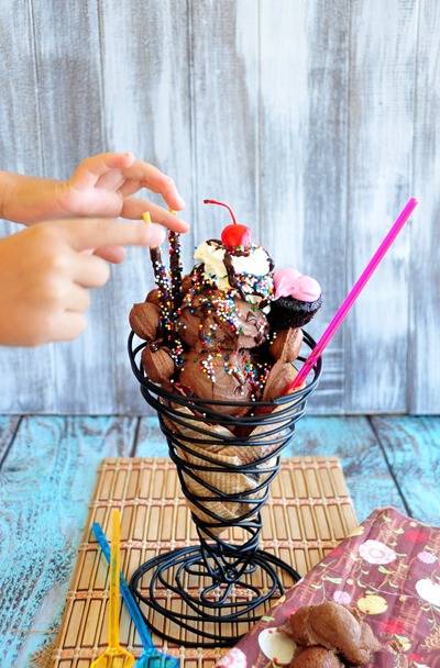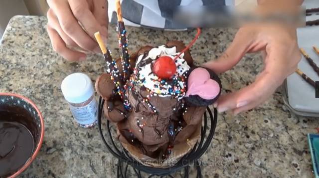 打搅好的奶油、巧克力酱、装饰糖果、樱桃