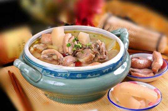 材料:鸭子,酸萝卜汤料,春笋,花菇,白萝卜