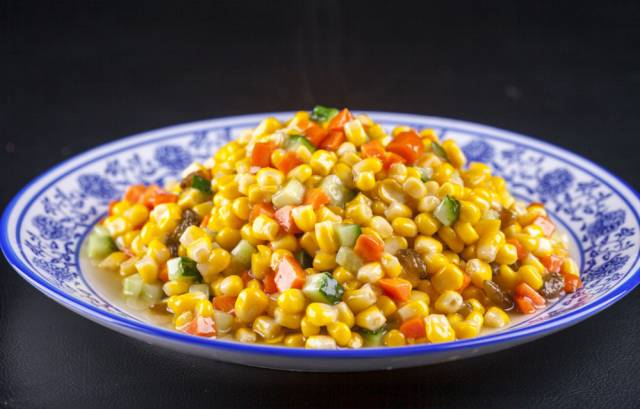 5.锅中倒入油大火加热至7成热时,倒入玉米粒。