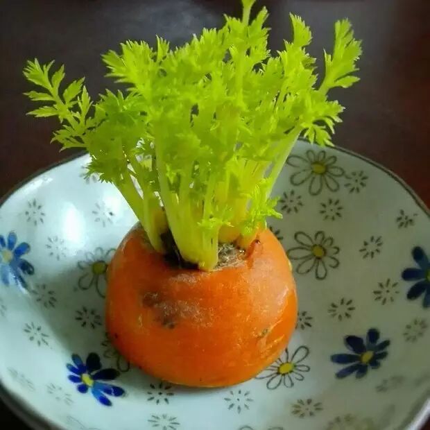 ▪ 水培:将切开的部分放上一天晾干后,胡萝卜切面朝下,平放在容器中,加少量清水(最好是静置一天的自来水)。平时1-2天更换新水。