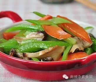 3、热锅凉油,先放入香菇和胡萝卜炒香,再放入西芹,翻炒2分钟,调入盐即可起锅。