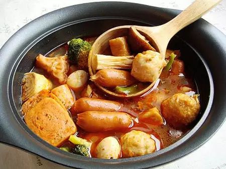麻辣烫底料150g、牛肉丸50g、包心鱼丸50g、鱼豆腐50g、面筋50g、腐竹50g、香菇50g、西兰花50g、豆腐卷50g、火腿片50g、清水适量