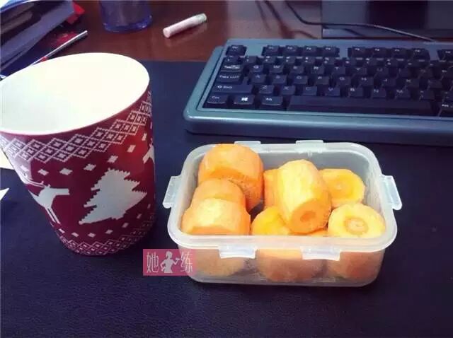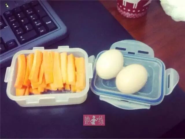 中餐:2个煮鸡蛋,一大根切碎胡萝卜