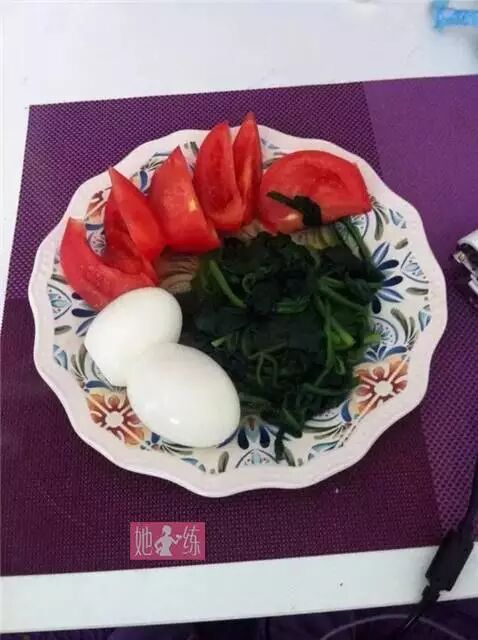 中餐:2个煮鸡蛋,一个西红柿,水煮菠菜