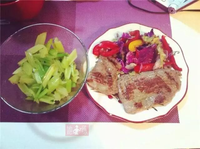 牛排 + 生菜沙拉 + 煮芹菜(虽然东西很多,但是吃完超级不满足)
