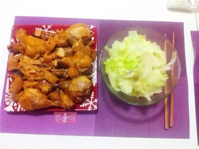晚餐:半只鸡,生菜沙拉,拌橄榄油(其它油也可以)和柠檬汁