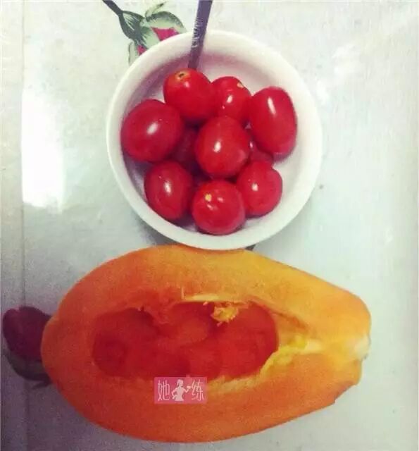 木瓜半个 + 圣女果(应该是一个西红柿 + 一个水果 + 煮芹菜)