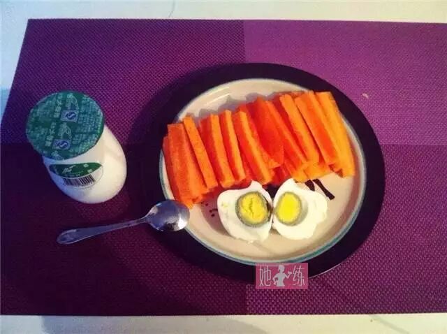 晚餐:1个煮鸡蛋,一大根胡萝卜切碎生吃,一杯200g的白干酪