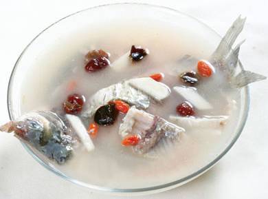 食材:鲤鱼 500克,山药25克,枸杞子25克,枣10克,桂圆肉25克,黄酒 100克。