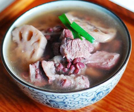 食材:牛腩600克,莲藕500克,红豆15克,生姜4片,蜜枣2个。