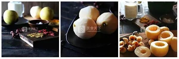 雪梨3个、牛奶500毫升、枸杞3克、红枣10颗、冰糖20克、干桂花5克。