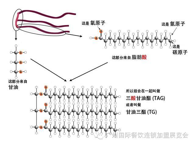 咱们平时说的脂肪,其实有个拗口的名字,叫“甘油三酸酯”,这个名字不重要,但这里面的“酸”却非常重要,这里的“酸”指“脂肪酸”,每个脂肪酸都有一条由碳原子组成,把三个脂肪酸并排连在一起,就是咱们平时说的脂肪。