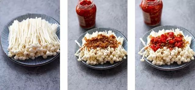 2、将剁椒铺在金针菇上。