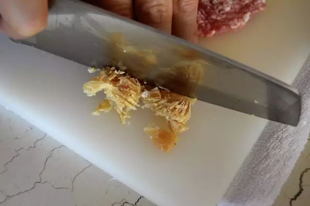 2、猪肉剁碎,把咸鱼切末,加入肉末中,并且加入料酒、盐、糖、白胡椒粉搅拌上劲,成馅