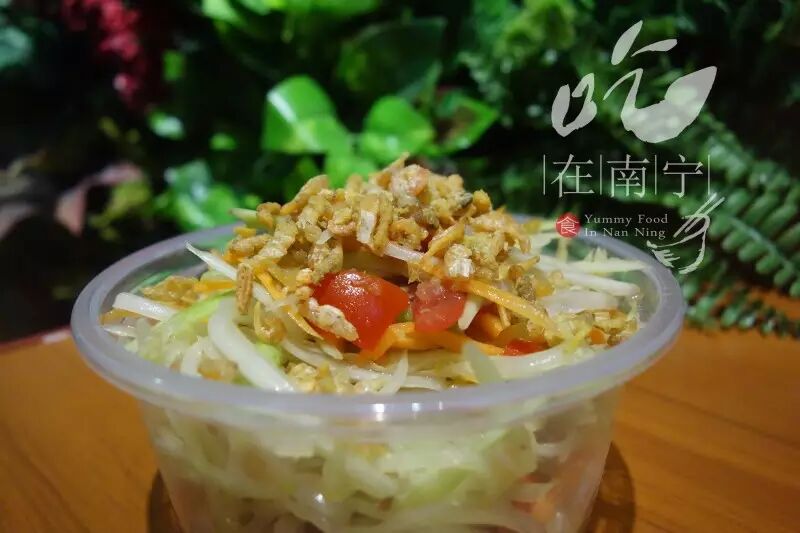 巴度可不仅有奶茶喝甜品,还有泰式木瓜沙拉。用料丰富,木瓜丝、胡萝卜丝、豆角、青柠、圣女果、蒜头、辣椒、鱼露酸角汁、椰糖,把这些混在一起捶打,所有的味道混搭,最后还加上虾米,口感丰富独特,味道棒的没话说!