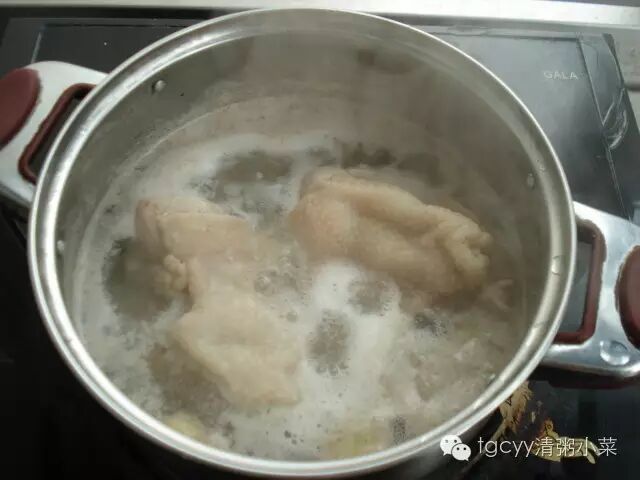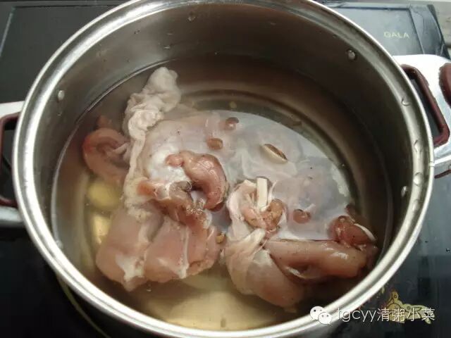锅里放入凉水,料酒,姜片,鸡腿肉。