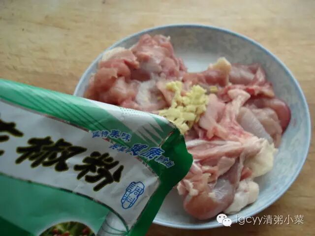 鸡腿去骨后放入姜末,花椒粉,盐,料酒抓匀后腌1小时。