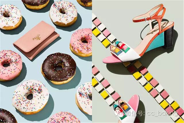 高级名牌的配件以及香水,结合美味的甜点,以明亮大胆的颜色呈现出来,让人眼睛一亮。