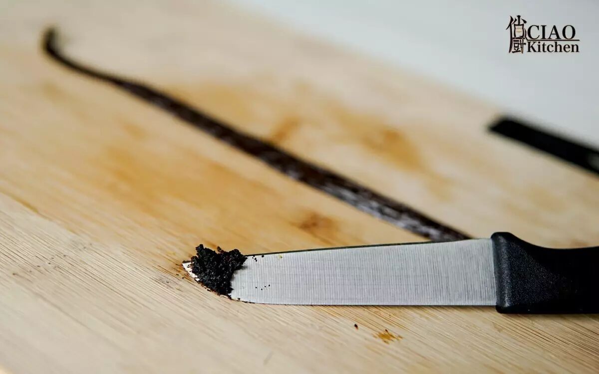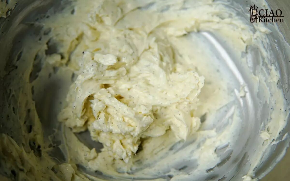 3 / 把奶油奶酪放在室温下软化,加入盐、细砂糖和香草籽。