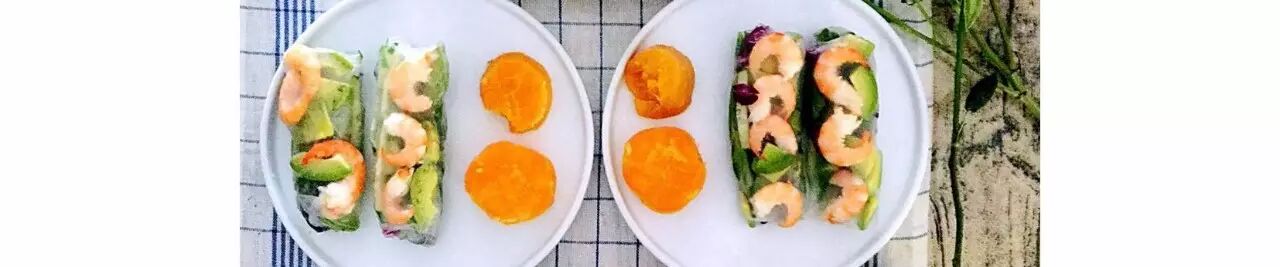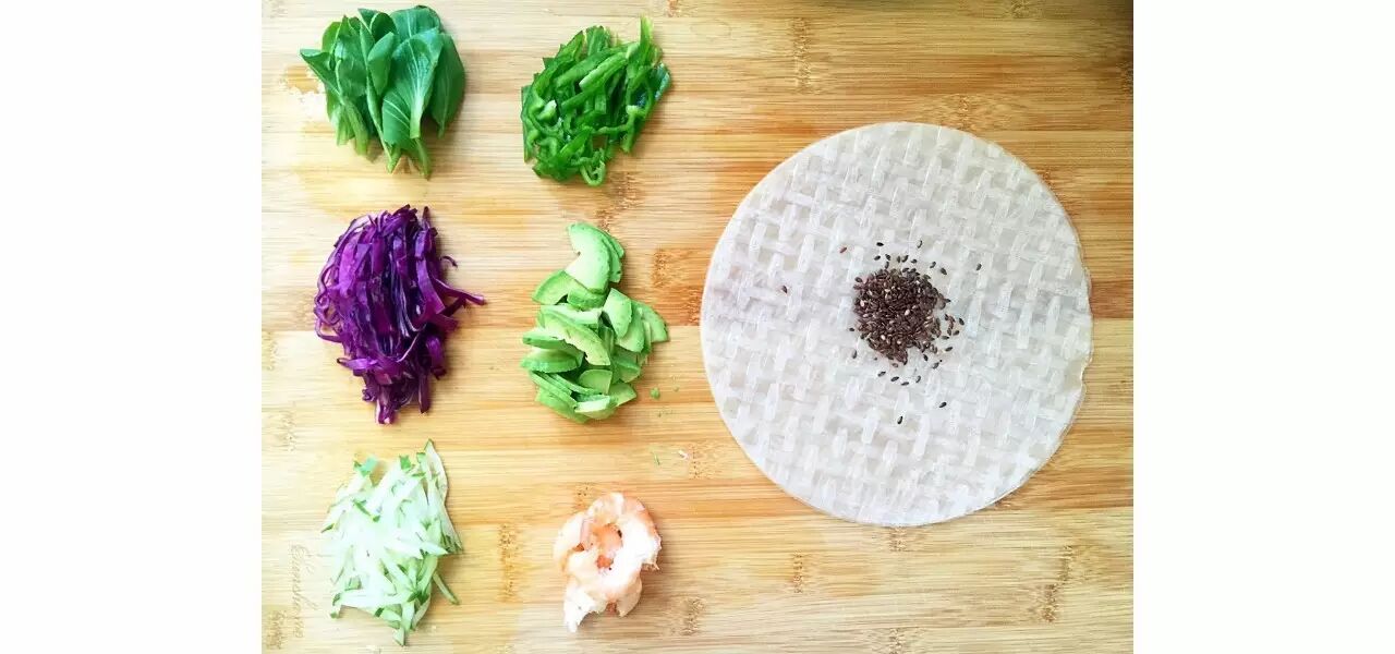 ▼ 把甜椒、黄瓜丝铺上,另起一行铺上虾尾、牛油果,撒上亚麻籽