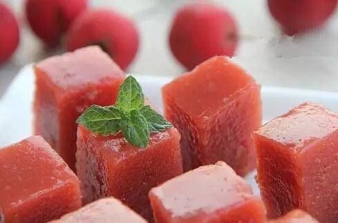 金糕又名京糕、山楂糕,是一道汉族特色糕点。它以山楂为主料,佐以白砂糖、桂花精制而成。它除了切块吃之外,还可撒上白糖,或与梨丝拌着吃,酸甜绵软,味美可口。