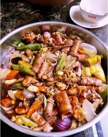 ▲服务员先把果蔬铺进锅底,然后再在上面铺满厚厚的一层腌制好的鸡肉,看着真的好诱人。