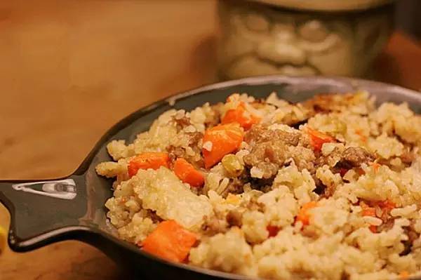 4、打开盖子,夹出料包,将胡萝卜丁和剩余的洋葱丁倒入锅中煮1分钟后,连汤一起倒入电饭锅中,汤不要太多,以刚没过所有材料为准。将浸泡后的大米沥干,平铺在羊排上(这时汤不会超过大米,如果多了,用勺子盛出一些)。将电饭锅盖子盖上,按下煮饭键,当它自动弹起时就做好了,打开盖子用勺子从底部向上将饭搅拌几下即可。