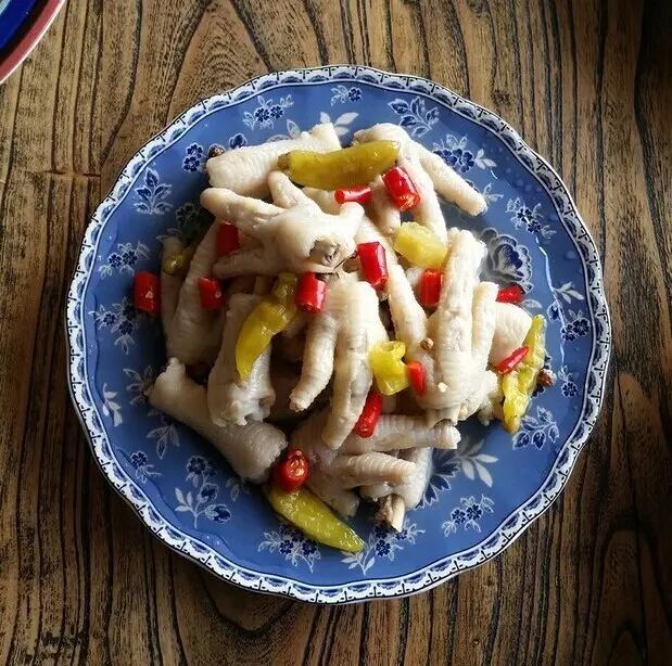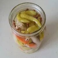 4.准备好白醋和泡椒,一个空的玻璃瓶。将鸡爪放入玻璃瓶,用泡椒水浸泡,根据个人口味,调入适量胡萝卜块,白醋,姜汁,花椒粒,盐,鸡精,矿泉水。