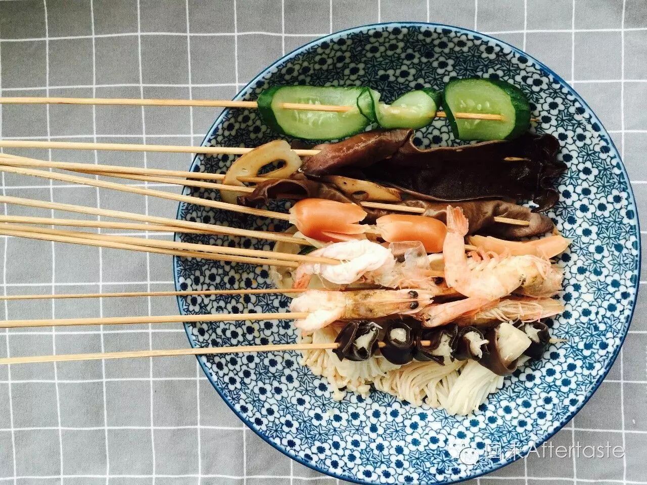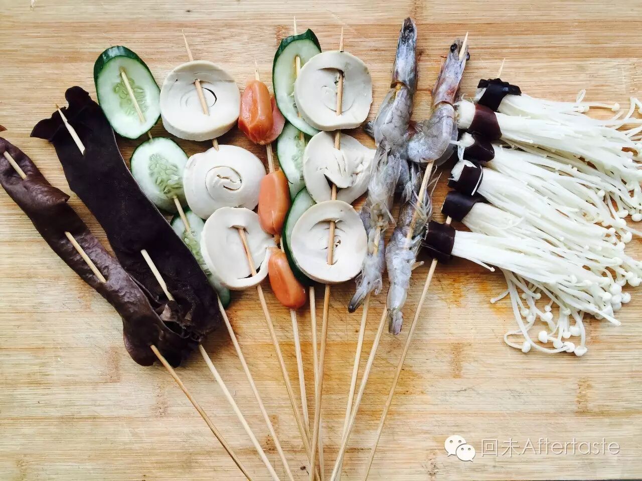 2、处理好虾、脆皮肠、金针菇、毛木耳、黄瓜、豆腐卷、藕,穿成串。
