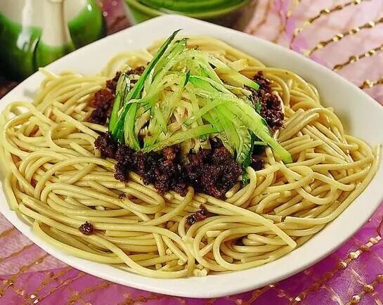 材料:白斩鸡数块、面条、黄瓜、芝麻酱、麻油、糖各1大匙、酱油2大匙、辣椒粉适量