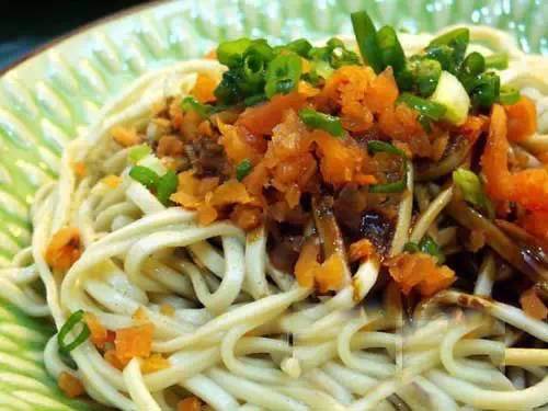 村料:面条200克,猪肉馅400克,芽菜100克,大葱末25克,姜末10克,蒜茸10克,辣椒面1.5克,芝麻酱10克,油菜心1棵,香菜少许。