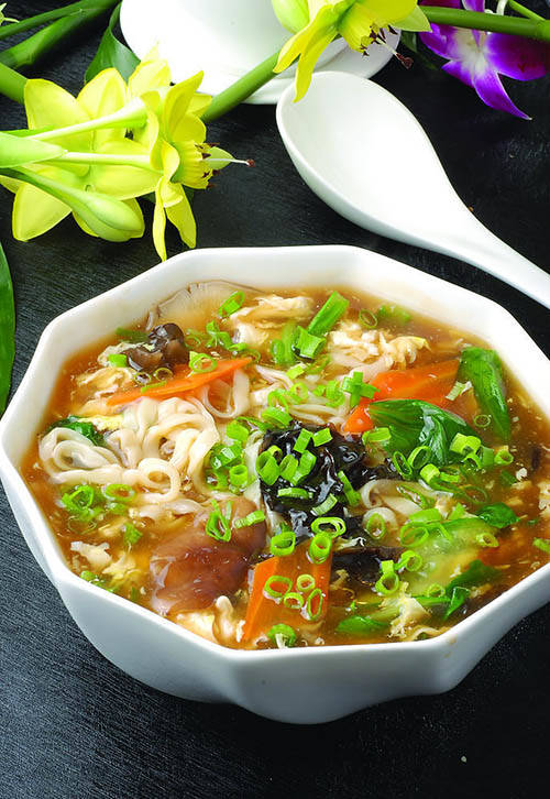 5、另起一汤锅将面条煮到约八成熟后捞出盛在碗中,加入之前煮好的料,烫好的青菜,加入香醋、花椒粉、红油、芝麻、香葱拌匀即可。