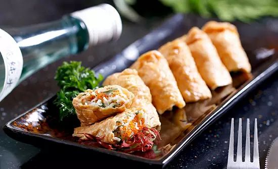 7、不粘锅下油,油热,放入腐皮卷煎至腐皮卷要用小火慢慢煎至两面微黄即好。