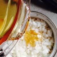 2、取半瓶蜂蜜,将切好的萝卜粒倒入蜂蜜中。