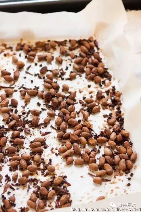3.烤盘里铺烤盘纸,捞出煮好的花生米,连花椒,辣椒一起倒进烤盘,铺开。300F烤40分钟左右,放冷等到花生酥脆就可以吃了。