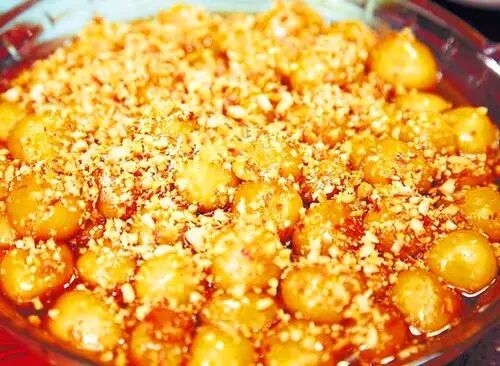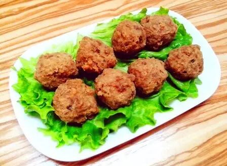 南安诗山的风味小吃,呈圆球状,金黄色,口感外脆内酥。以瘦猪肉为主,佐以葱头、豆干、地瓜粉、荸荠、少许肥猪肉,捣碎后捏成肉丸,然后蘸鸡蛋油炸而成。品尝时,蘸点永春老醋,味道更佳。