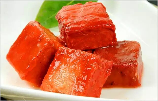 南安太同红腐乳:其外表鲜红,质地软嫩细腻,鲜、甜、咸适度,有酒、脂芳香。