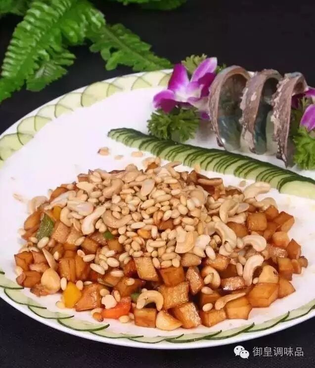 3、锅留底油烧至四成热,下葱姜末爆香,下入拉过油的鲍鱼丁、杏鲍菇丁、辣椒粒,加御皇金牌鲜味汁、盐、珍膳味五谷原味鸡粉、白糖调味,快速翻炒出香后盛出装盘,表面点缀炸好的腰果、松子即成。