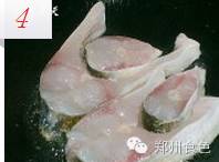 壁,等油烧热后下入鱼块,这比较不容易粘锅;放入鱼块的时候一定要将有鱼皮的一面朝下