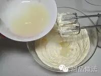 然后倒入里面冷却好的糖水。一定要注意,分次加入,每次用电打低速搅匀融合之后再加入下一次,防止水油分化,我是分6次加入的。