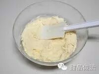 听有人说黄油打发过度曲奇会做不好,我这个虽然都是电打搅拌的,但是还好,没出现不好的状况。这是打好的黄油,我用刮刀抹平整了,可以看出来是略有光泽的。